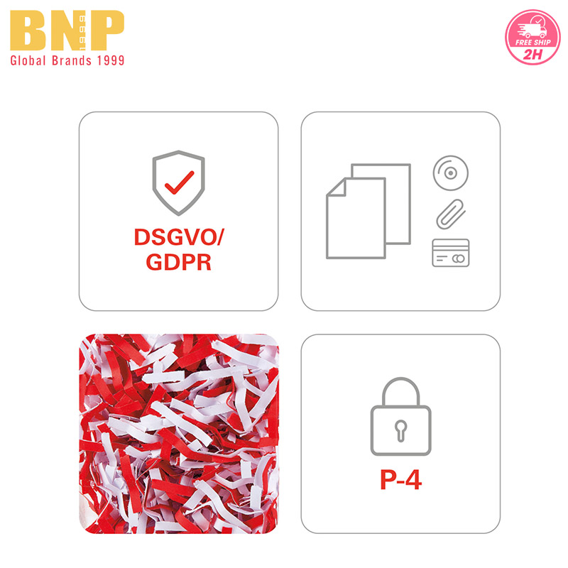 - Độ Bảo Mật P-4 (Theo tiêu chuẩn DIN 66399): Với kích thước mảnh hủy nhỏ, máy đạt cấp độ bảo mật P-4, phù hợp để tiêu hủy các dữ liệu nhạy cảm và thông tin cá nhân, đáp ứng các yêu cầu về bảo mật thông tin.